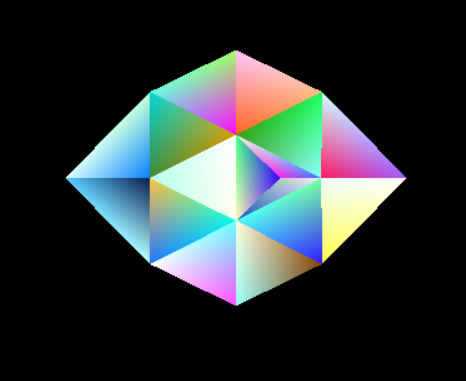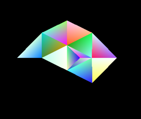 In order to enable debug colors, hit the 'd' key. This will enable a sort of gemstone appearance, in which each vertex of each face has a different color value (however, this will not be the same color for the same vertex in multiple faces). The default view is shaded based on the normals calculated based on face orientation. Note that there is an unexpected which will cause the color of the model to no longer be grey after toggling debug view.